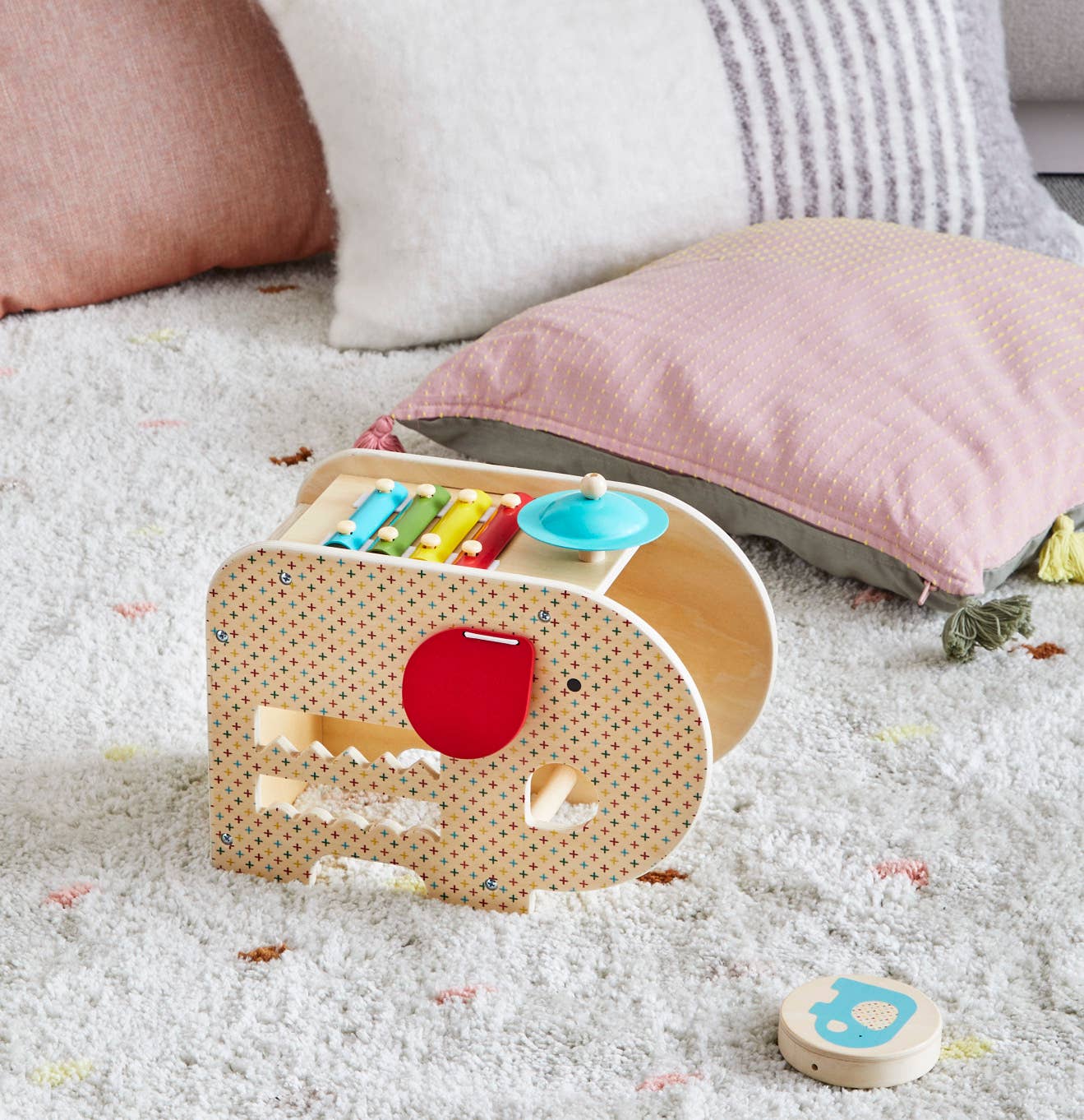 Introduce your little one to rhythm and sound with this all-in-one musical toy center. This versatile wooden elephant includes five different ways to play. Clack the elephant's ears to start your beat, then use its tail to play the xylophone, bang the drum, tap the cymbal, and sweep along the three guiros to hear the unique noises each of them makes. This Wooden 5-in-1 Elephant Music Toy will help develop your little one's fine motor skills, hand-eye coordination, auditory learning, and sound differentiation. Plus, the free nature of the play pattern encourages self-expression, decision making, and independent play. The toy is made from FSC-certified wood and printed with water-based inks. The packaging is made using 75% recycled material.