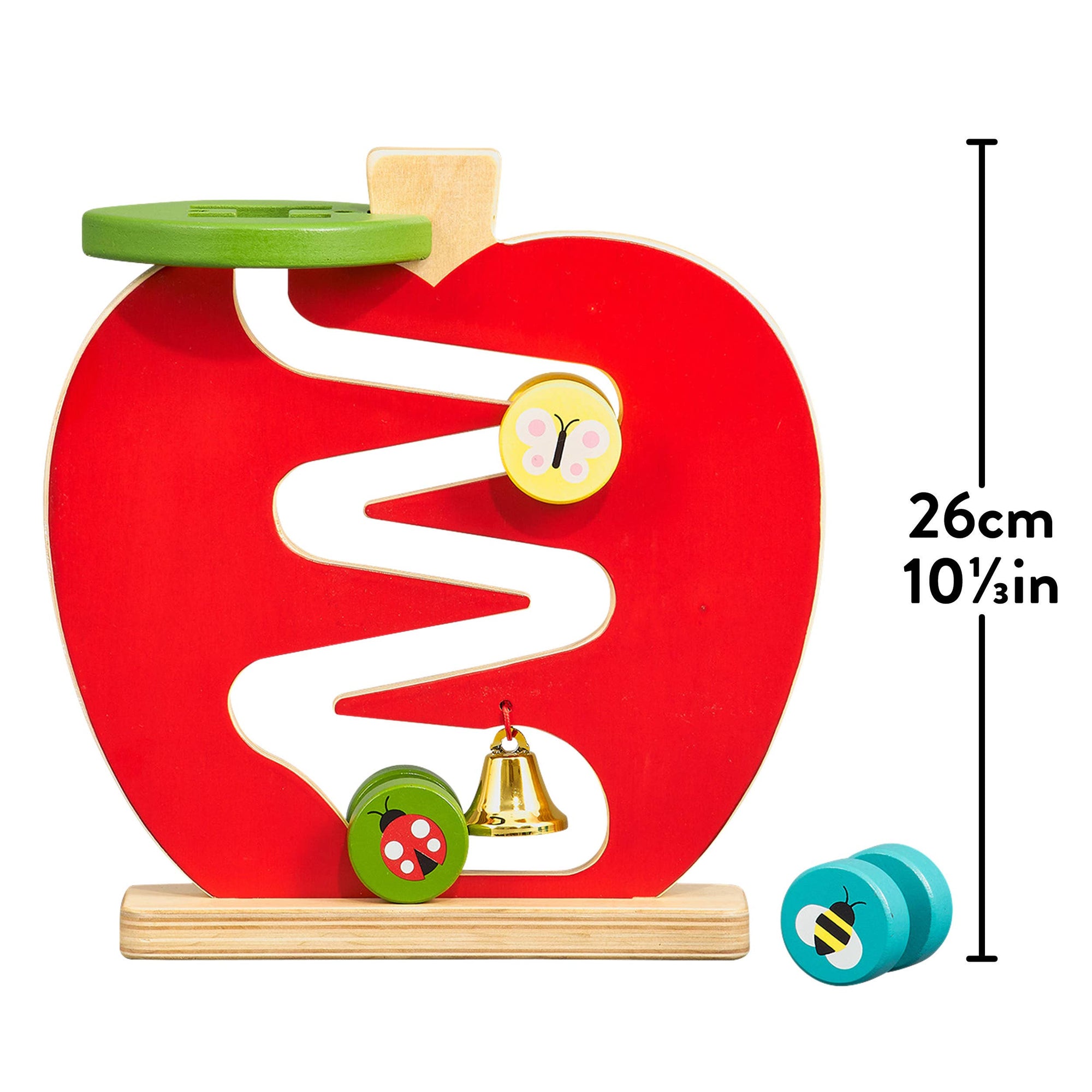 Can you follow the zig zag? Race your butterfly, bee and ladybird friends through the apple to ring the bell at the end with this Apple Run toy from Petit Collage! Ideal gift for toddlers Helps teach them crucial hand-eye coordination skills Made with FSC wood and printed with water-based inks Recommended for ages 3+ Measures 10" W x 10.5" H x 2.5" L
