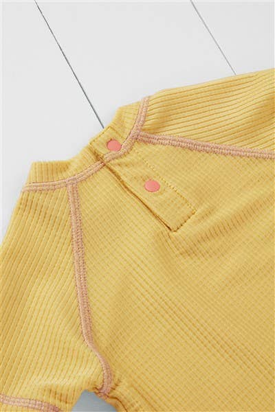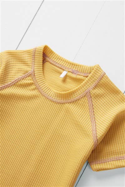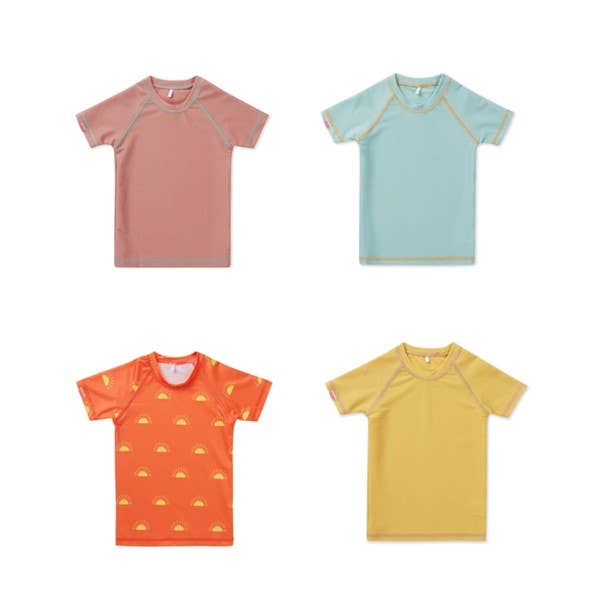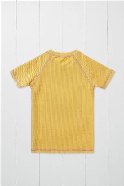 With this short sleeved kids rash vest, you'll have a useful item that can also serve as a t-shirt on the go. Our ochre yellow number features a high neckline and provides UPF50+ protection for kids. Plus, it's made from recycled materials, so not only is it eco-friendly, but it'll also keep your little adventurer comfortable with the soft-feel ribbed fabric that's gentle enough for sensitive skin. Finished off with fun contrasts and flatlock seams for maximum comfort.