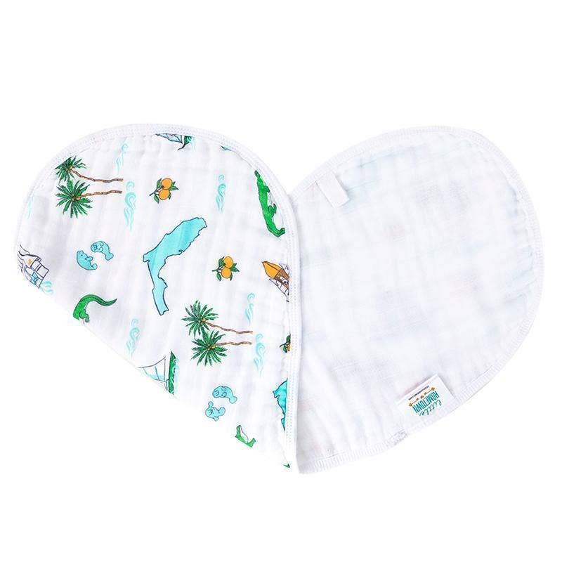What do you get when you put manatees, alligators, palm trees, oranges, boats, and rocket ships on a swaddle? Just about the cutest Florida baby gift you'll find! This present is a hit with mothers who use it both as an over-the-shoulder burp cloth and later as a bib with snaps. It will grow with your newborn as the switch from newborn burp cloth and infant bib.