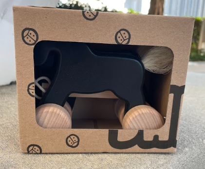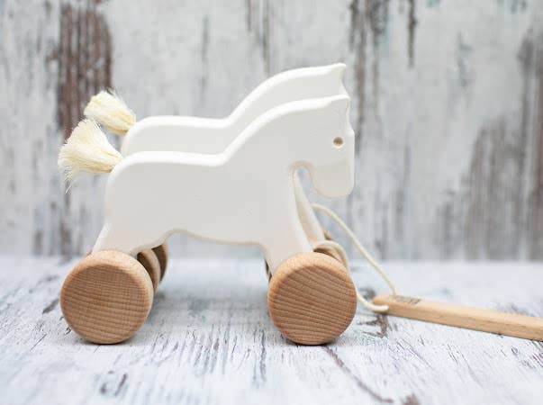 This sweet pair of pull along horses take turns bobbing up down, appearing as if the two horses are galloping together. The children love to pull these horses along, watching as they race smoothly across the floor. The children will be excited by the movement of the horses and interests will be kept peaked. The shape of the wood will have them interested in animals and spark their imaginations.