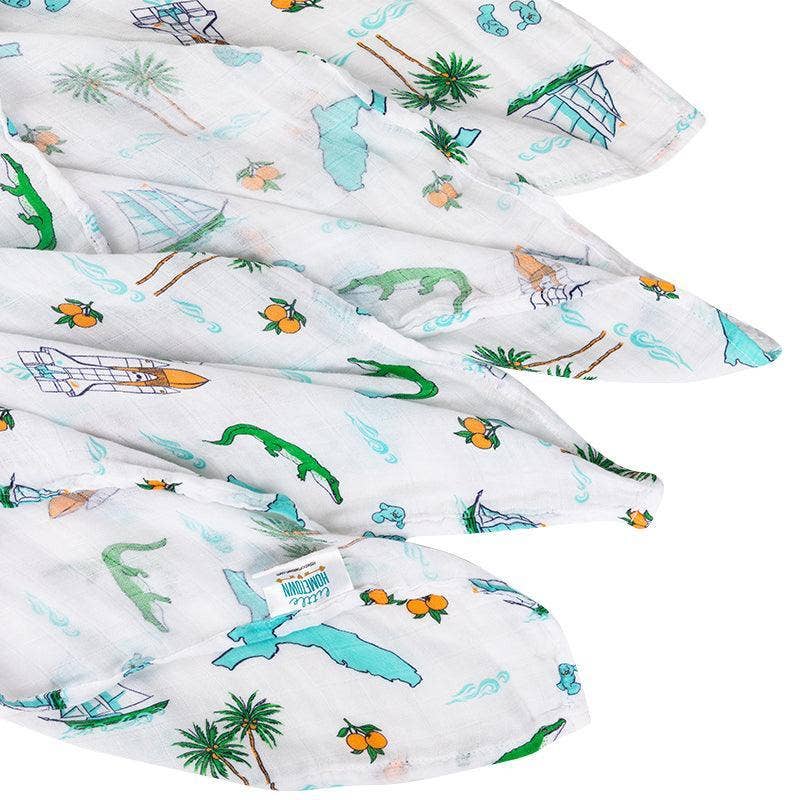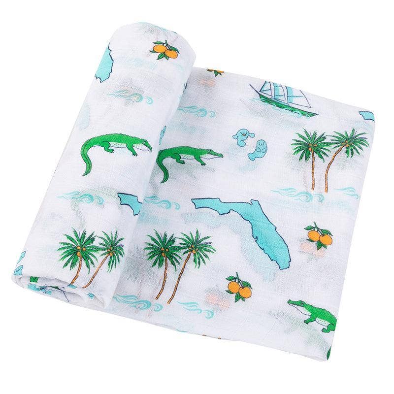 The perfect gift for any baby shower. What do you get when you put manatees, alligators, palm trees, oranges, boats, and rocket ships on a swaddle? Just about the cutest Florida baby gift you'll find!