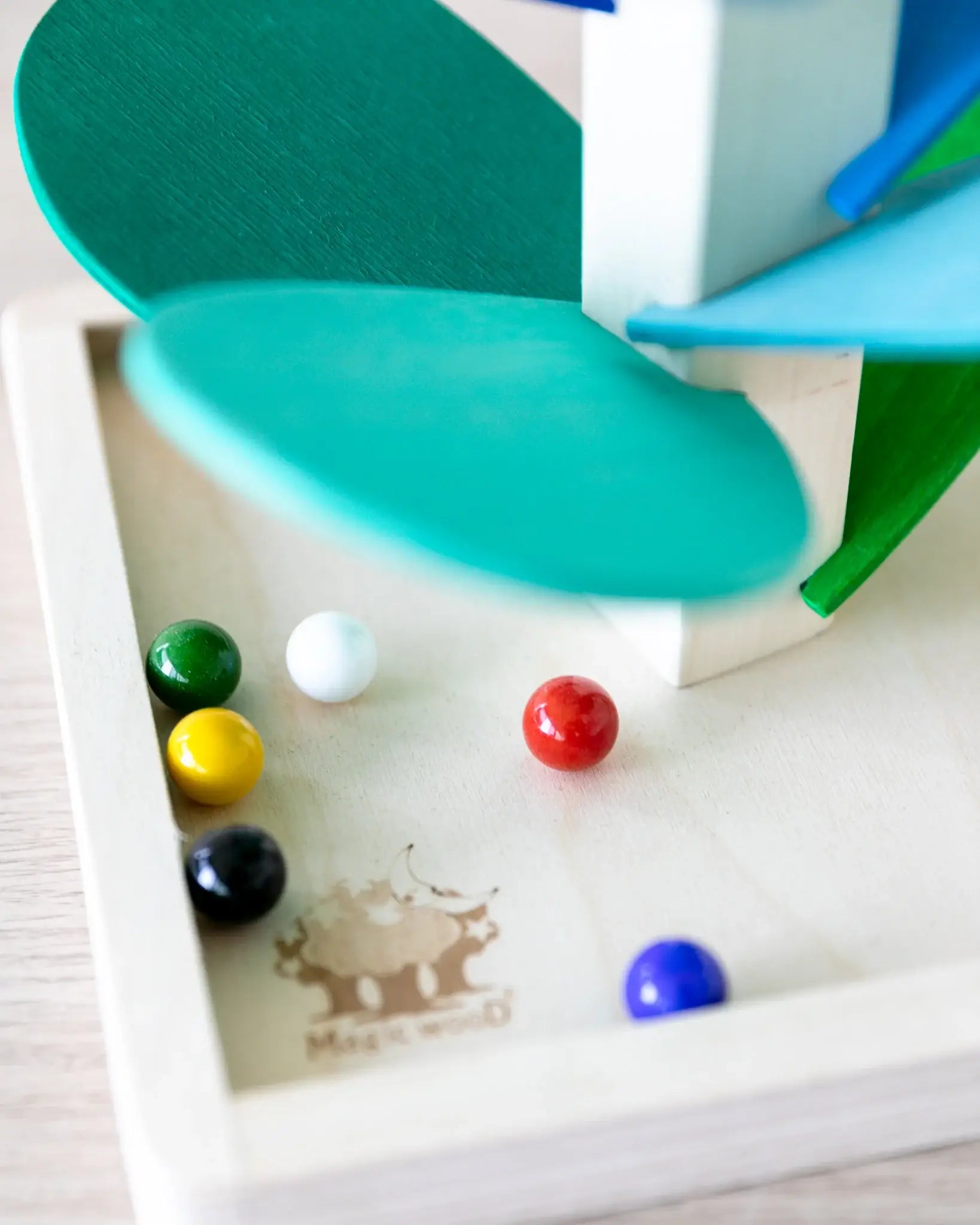Marvel at the marvelous melodies of this magnificent Magic Wood Marble Tree Mini! With six marbles, simply drop 'em from the top and listen as they create a cacophony of classical concord! Not only an eye-catching decoration, this wooden tower is a real riot for the senses!