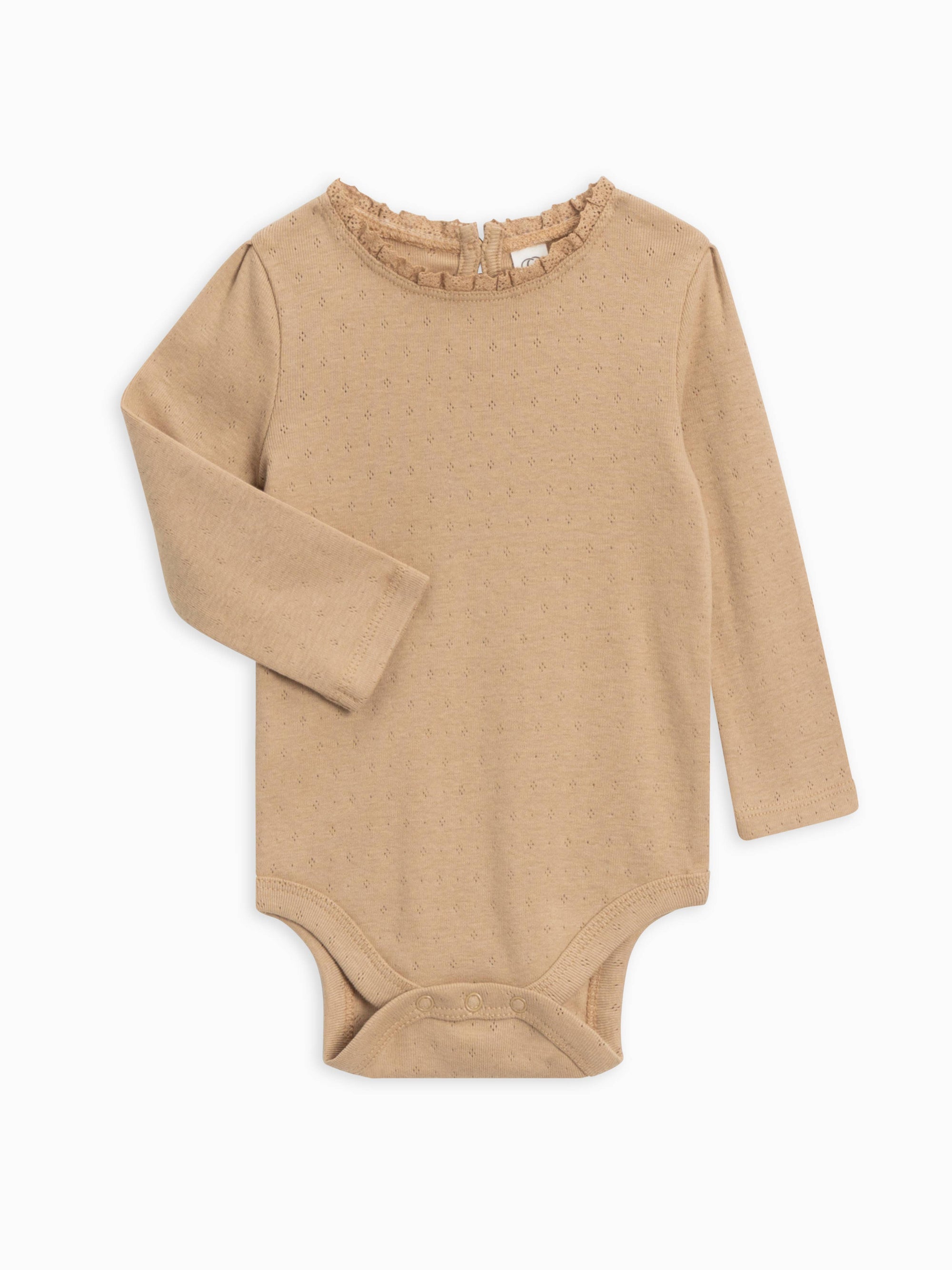 Introducing the Lina Lace BodySuit--total autumn awesomeness! The back boasts an easy-close coco-button keyhole, a detailed crochet lace neckline, and stylish Pointelle fabric. It snaps shut for access and has pleated long sleeves--the perfect way to jazz up your little one's wardrobe! Crafted from 100% organic cotton Pointelle fabric, colored with water-based dyes for long-lasting vibrancy, and sustainably and ethically made--this bodysuit has it all! Plus, it's naturally hypoallergenic AND machine washable--just perfect!