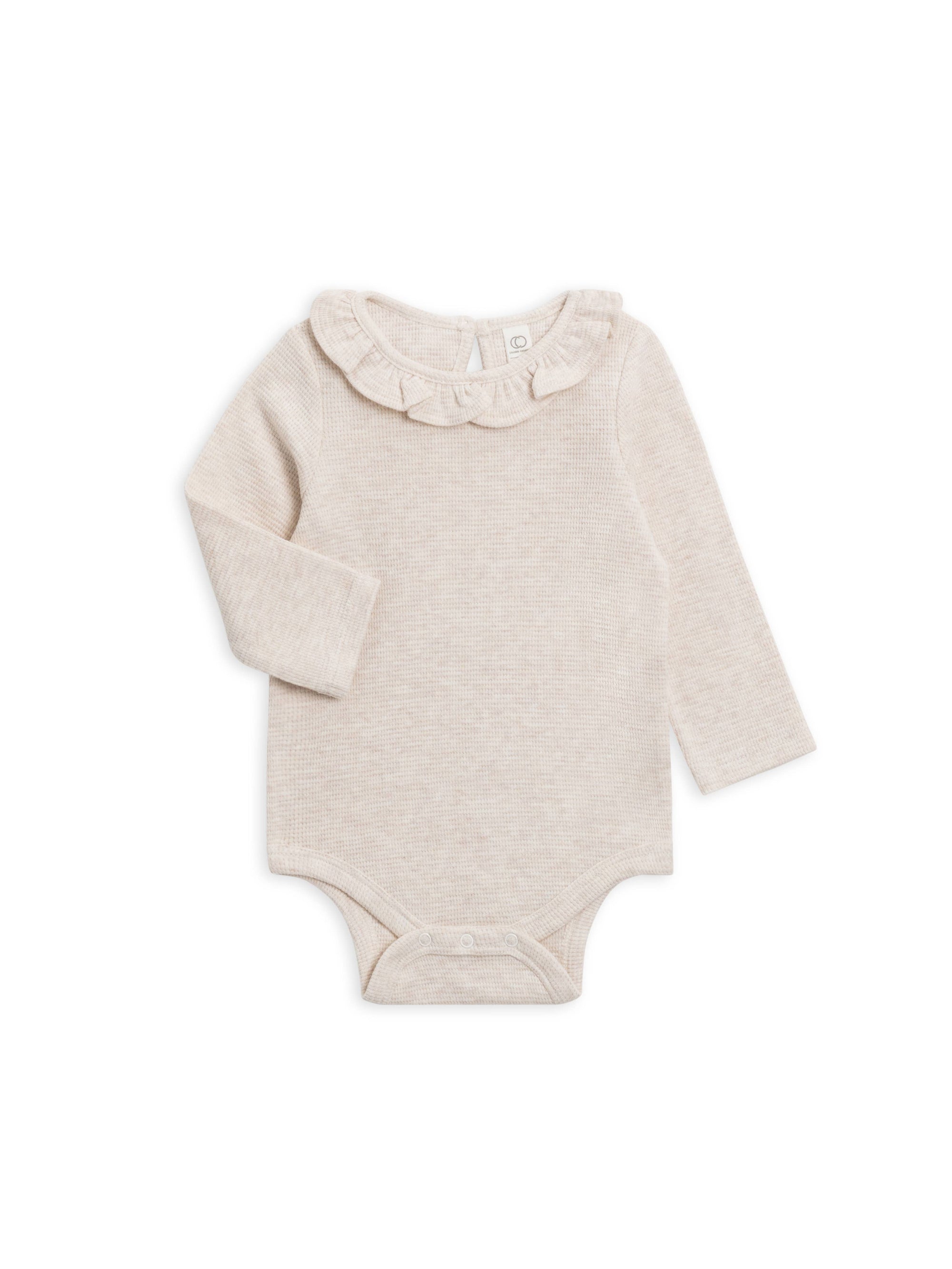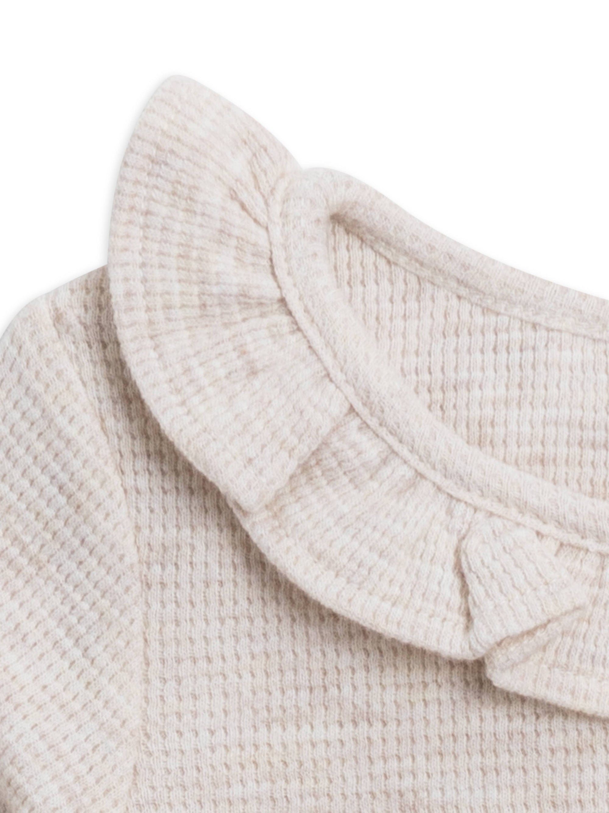 The Mae Waffle Ruffle Bodysuit is full of delicate details for the winter season. Made from waffle knit fabric, the bodysuit features crotch snap closures and front buttons for easy dressing and diaper changing, ruffle neckline and back neck keyhole with button and elastic loop. The bodysuit can be worn on its own or paired with our matching Nelson Waffle Jogger.