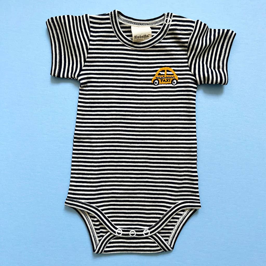 Style up your lil' one with the zaniest city on earth! Our Taxi Embroidery Baby Bodysuit is made of organic cotton and totally understated. NYC's classic navy stripe home to the miniature version of our beloved taxi rattle. Get ready for a wild ride with this stylish onesie. Beep, beep- it's coming for you! 100% organic cotton, machine wash and tumble dry. Snaps on the shoulder and crotch make diapering easy. Make your baby's wardrobe a fun ride!