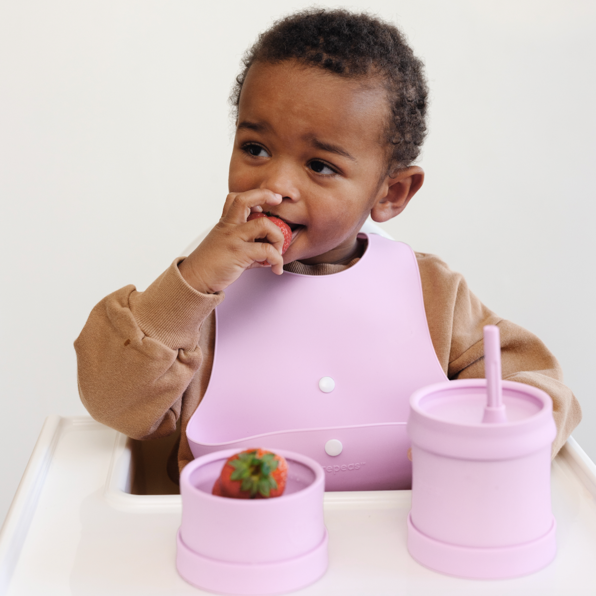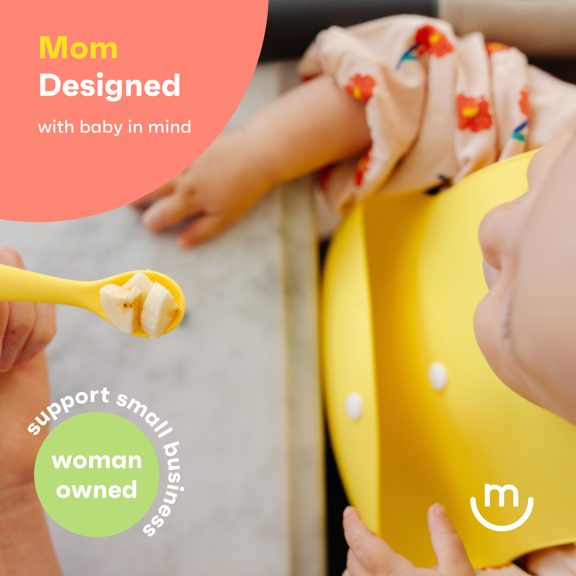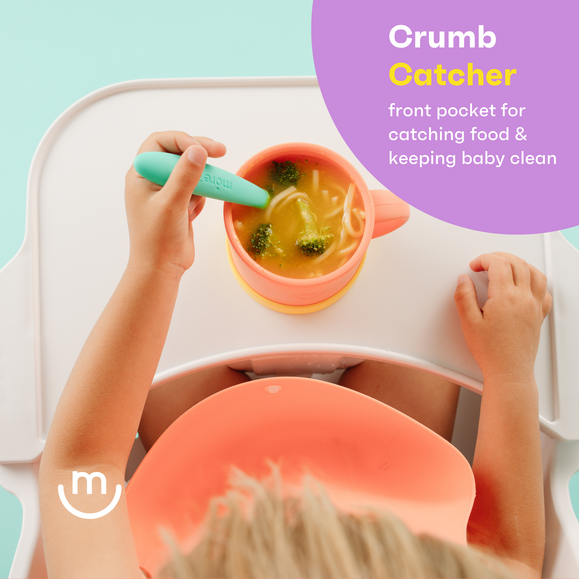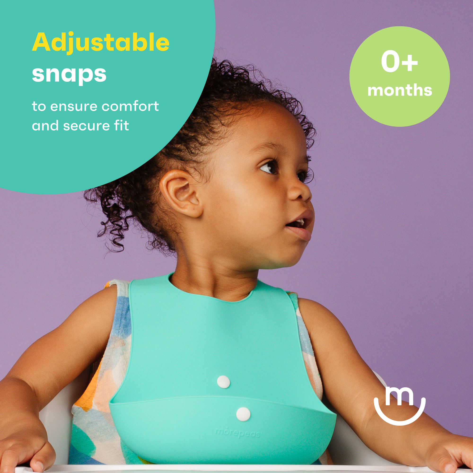 This all-in-one bib and spoon case is the the perfect companion for feeding at home or on-the-go. It easily rolls and snaps to contain mess or store spoons. The adjustable snap closures ensure a comfortable fit for baby, while the flexible front pocket catches food. Made from food-grade silicone, these colorful bibs are easy to clean - just wipe or toss in the dishwasher for mess-free mealtime.