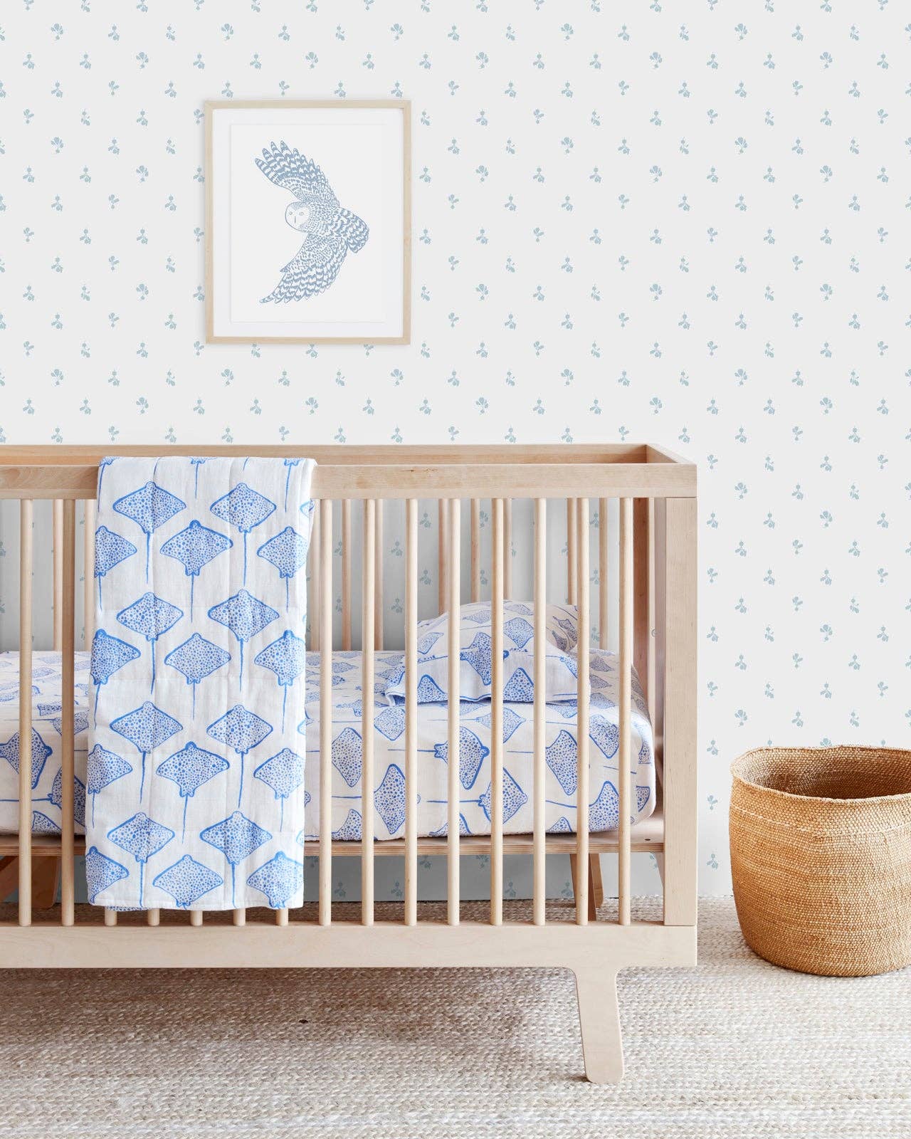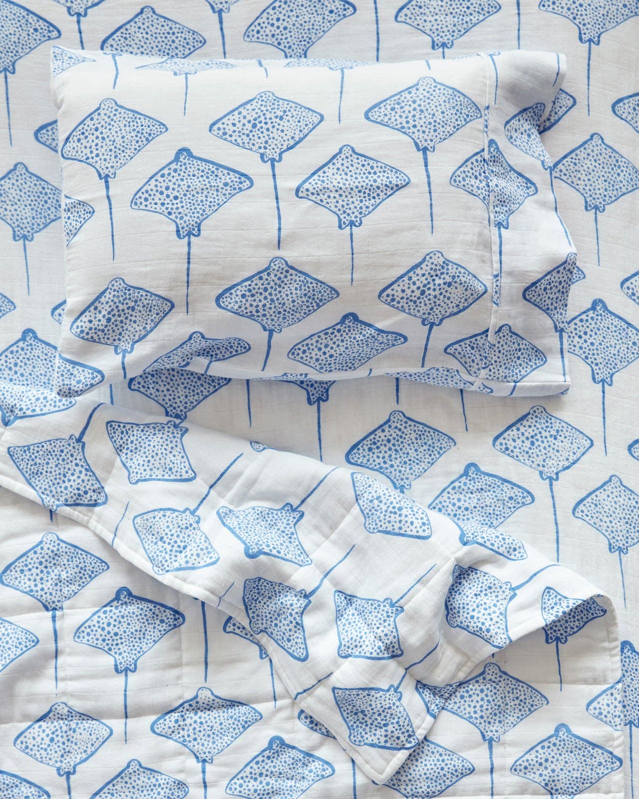 Crib Sheets are the easiest way to set the tone or refresh the Nursery. And in a beautiful print, it can make the space feel right for Baby and you. Our Stingray print celebrates the amazing textured skin of this fascinating creature. In our bright Marine blue, it's the happiest graphic print that looks beautiful on the crib sheet.