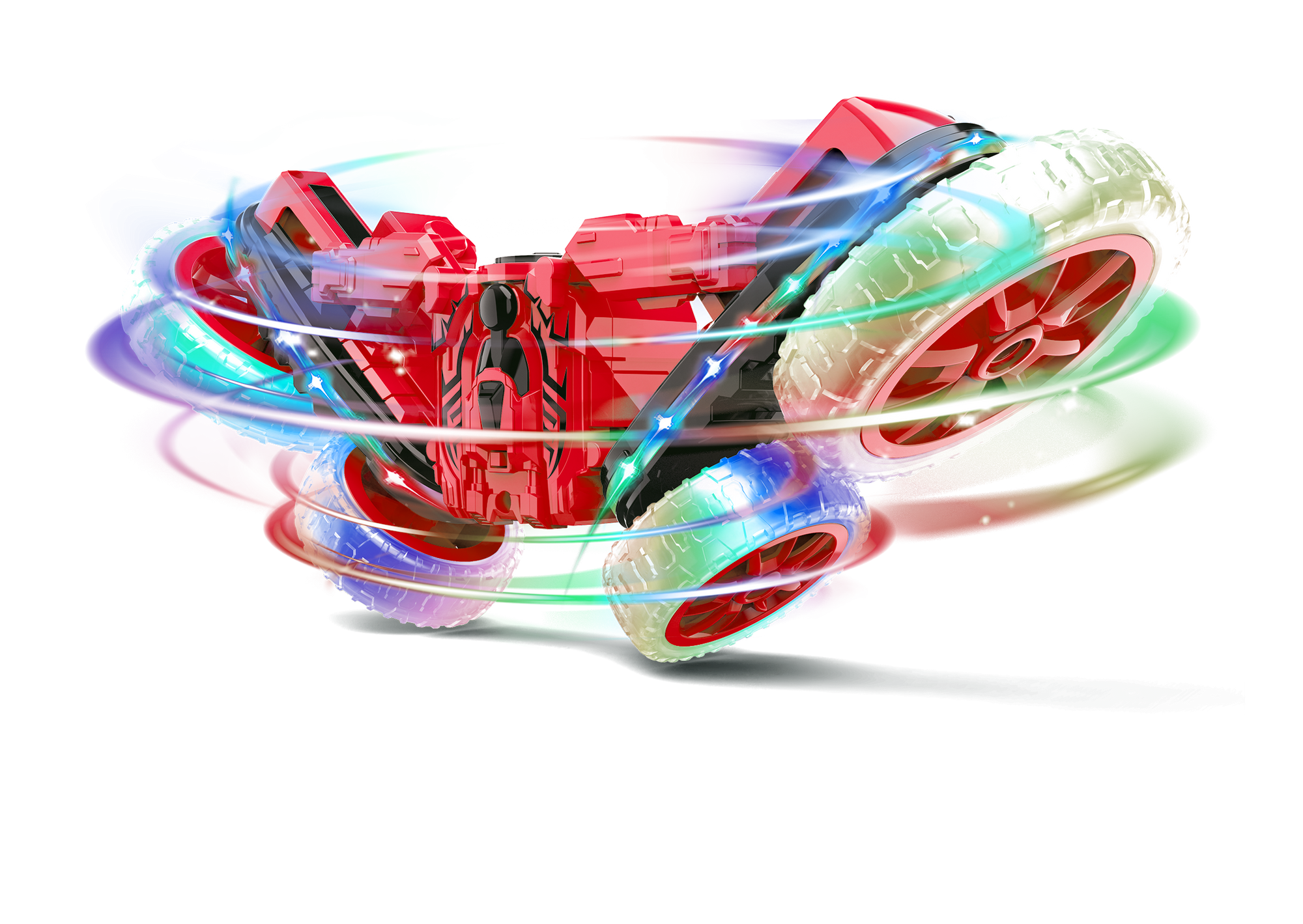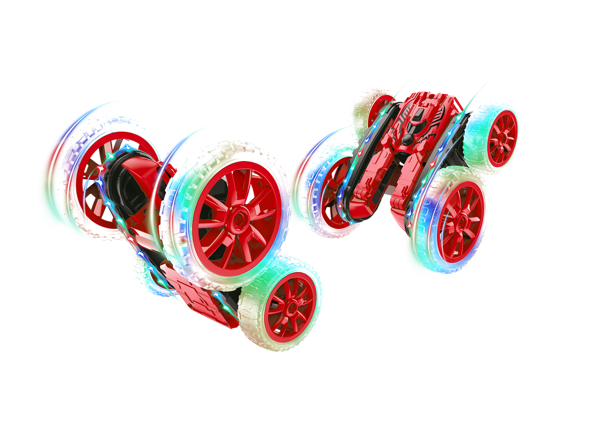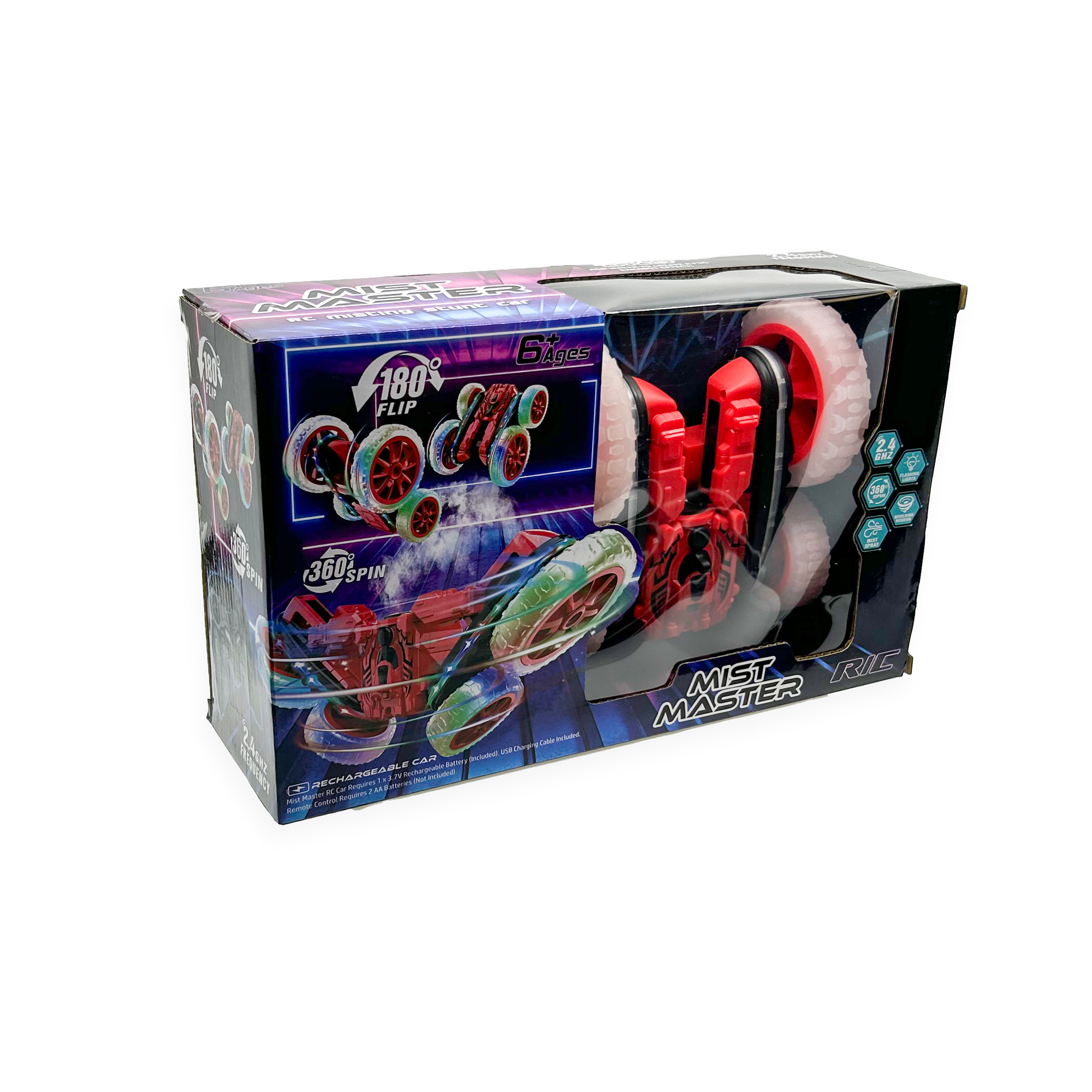 The Mist Master is a space age vehicle that puts a new spin on RC stunt driving. Each 4-wheel vehicle functions like a normal vehicle, but splits and spins at the push of the remote control. While spinning, the Mist Master can emit fog and light from its exhaust and can execute exciting 180° flips and 360° spins with ease.