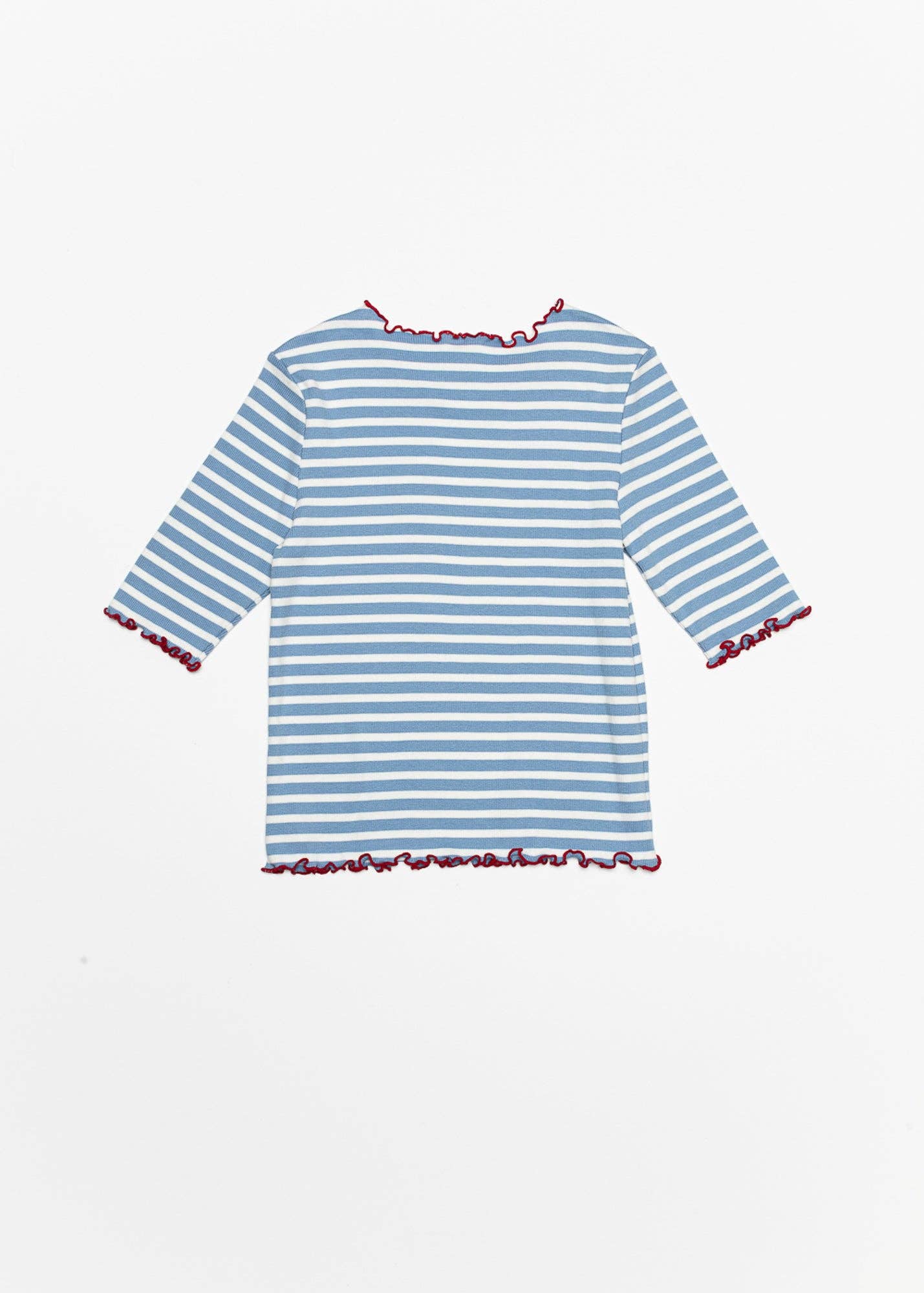 Our Valentine Top is sweet and simple in a ribbed knit fabric and happy blue-and-white stripes, creating the perfect backdrop for all the reds and pinks that come with this sweet season. With a touch of red at the lettuce-edged neckline, sleeves, and bottom opening, this style can easily be worn with the Tulip Skirt for an on-trend outfit.